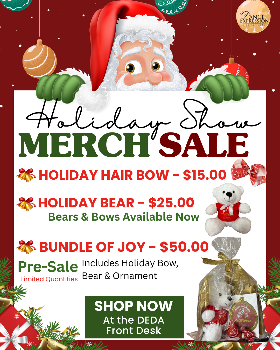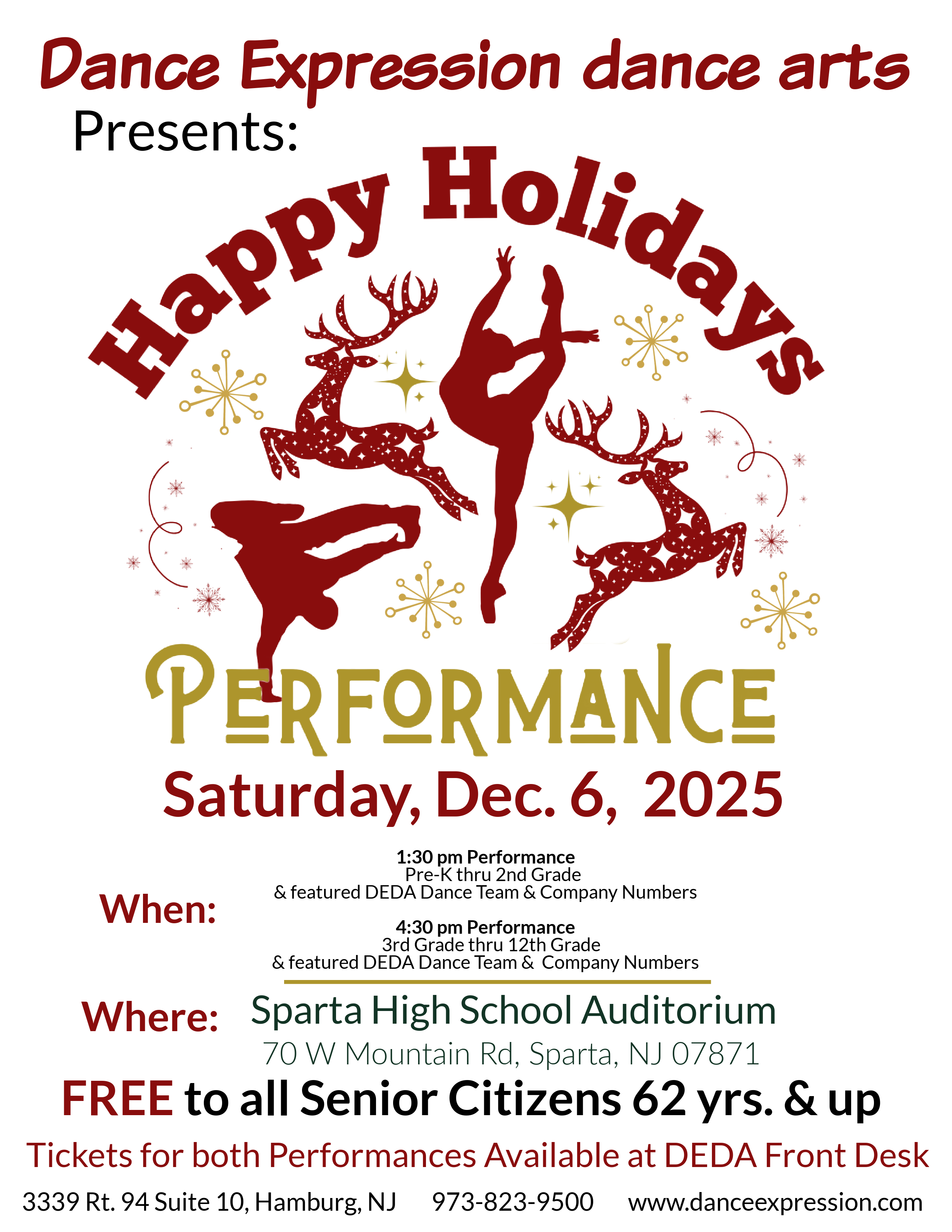 Our 2025 Holiday Performance is scheduled for December 6, 2025. It is an exciting and fun filled event when the students of Dance Expression dance arts have an opportunity to share their love of dance and spread holiday cheer.